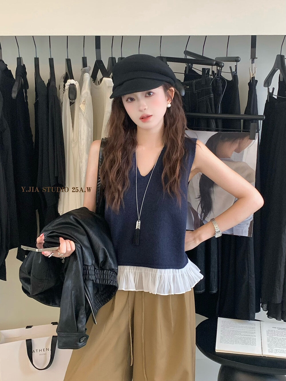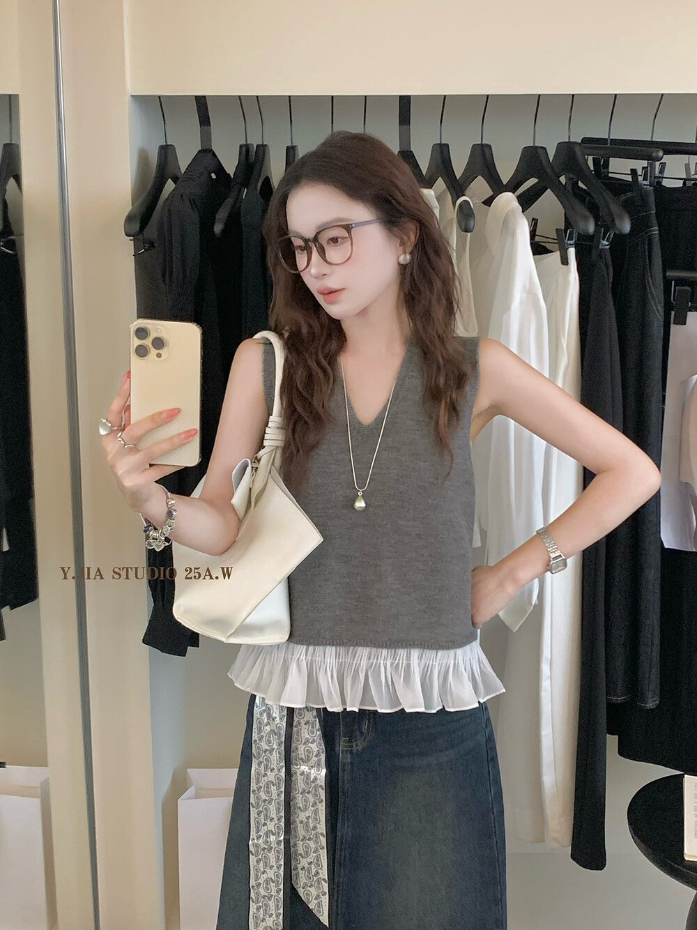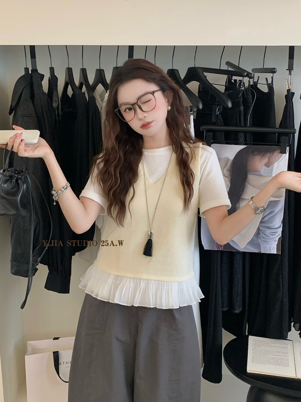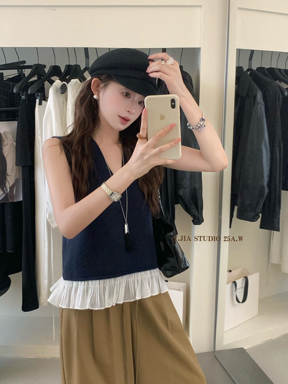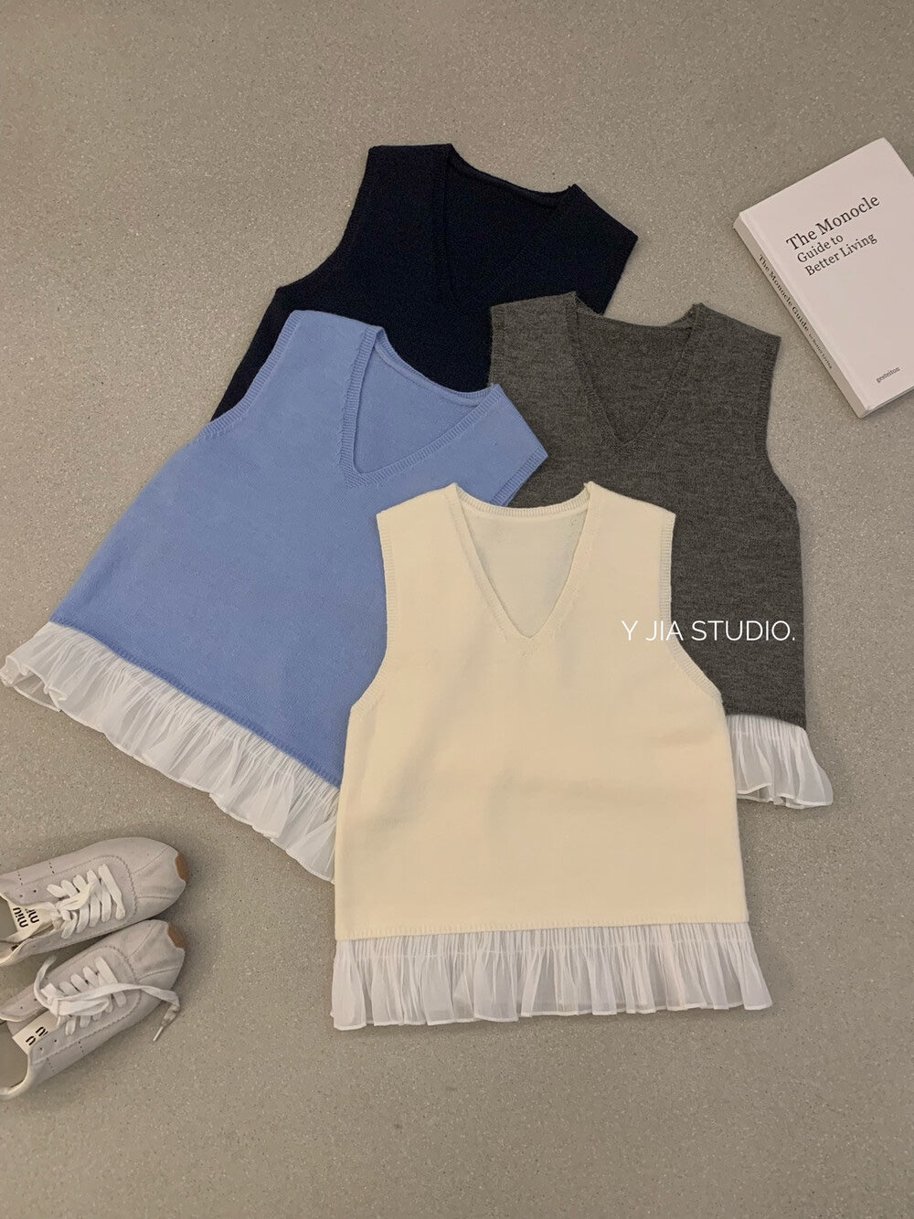 【新品】508-5 层次感假两件蕾丝下摆无袖上衣