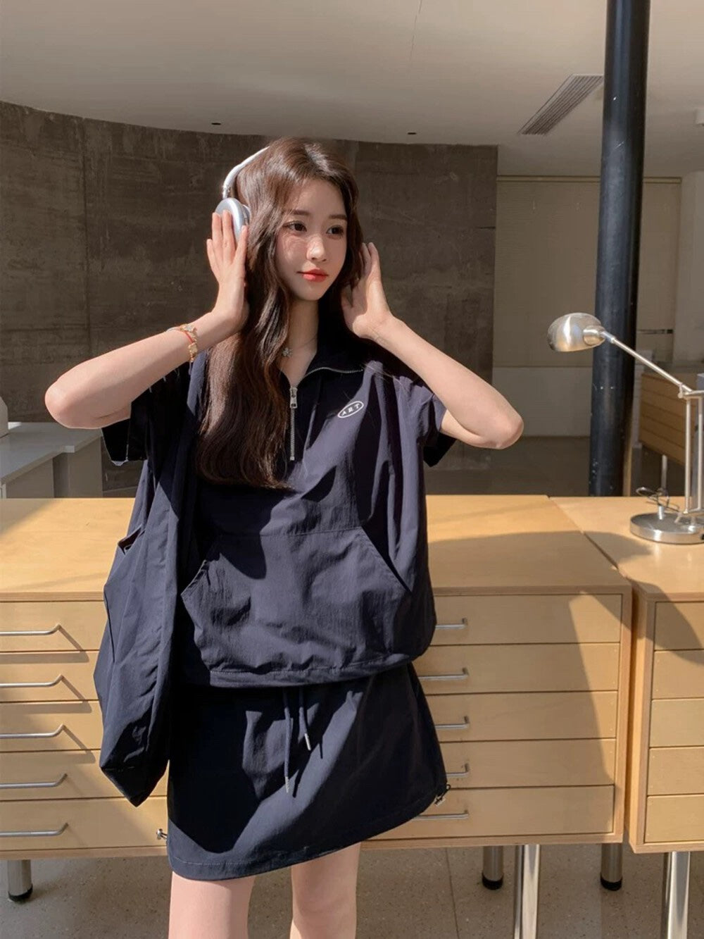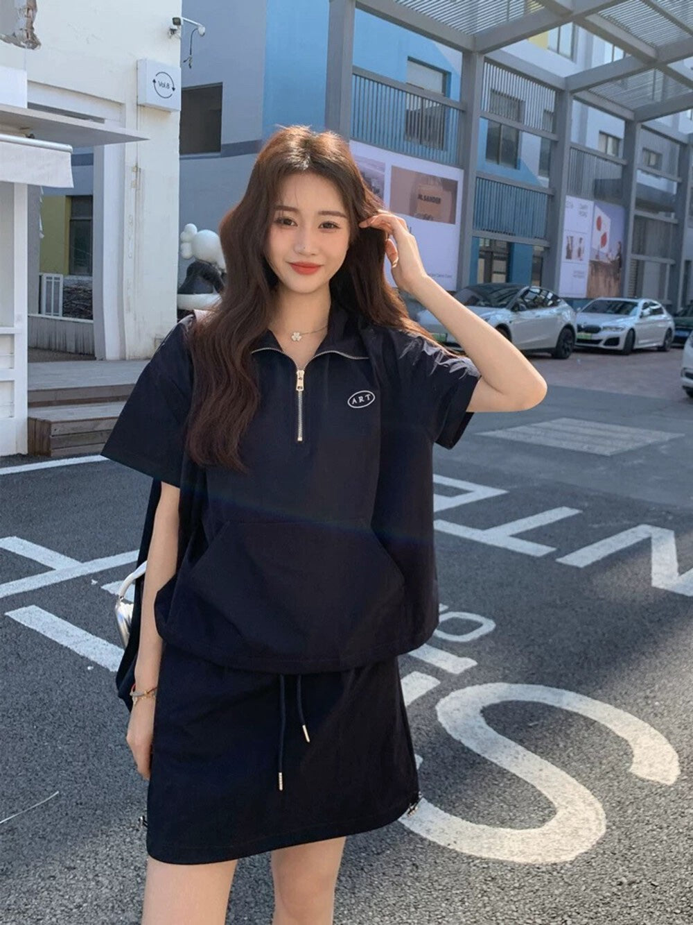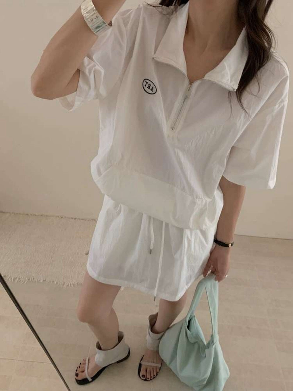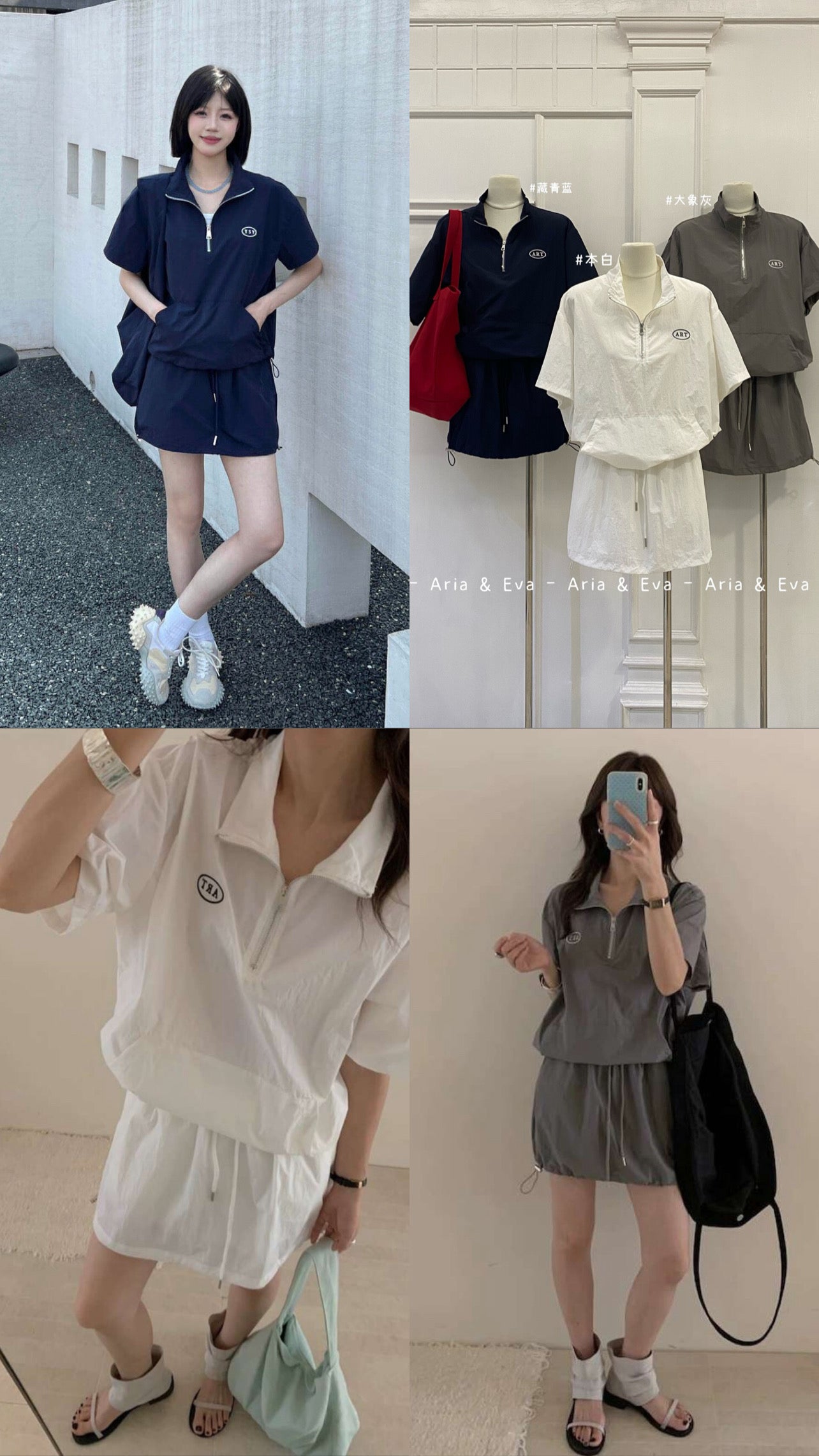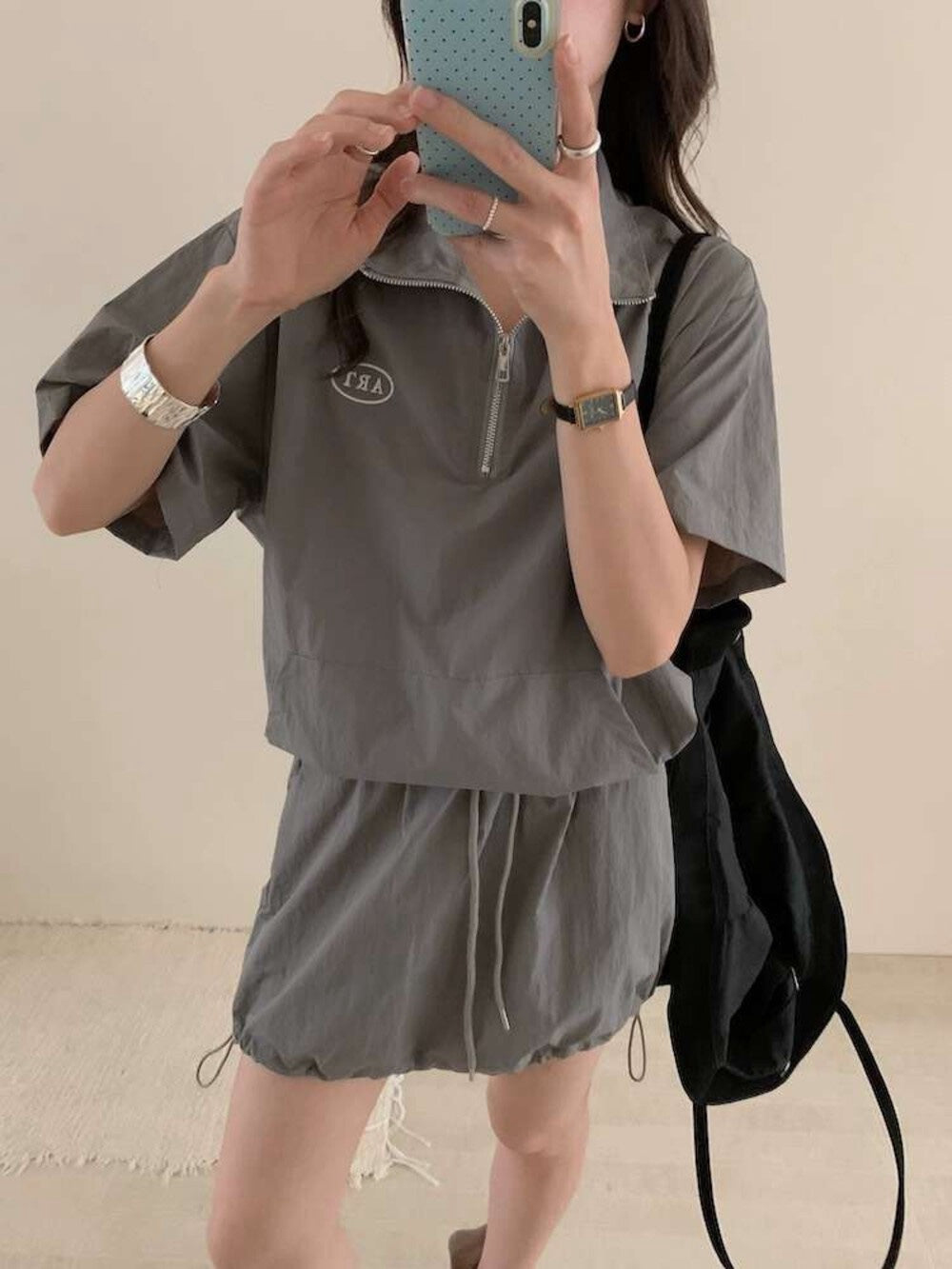 【新品】AE250758 韩系2件套 半拉链短袖上衣+抽绳半身裙