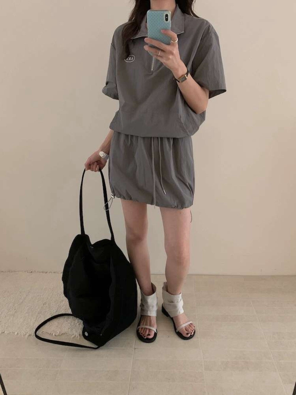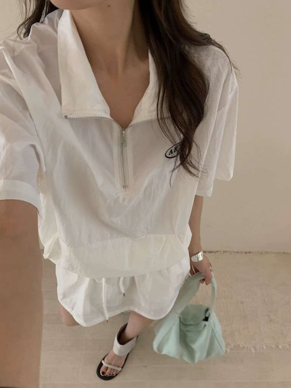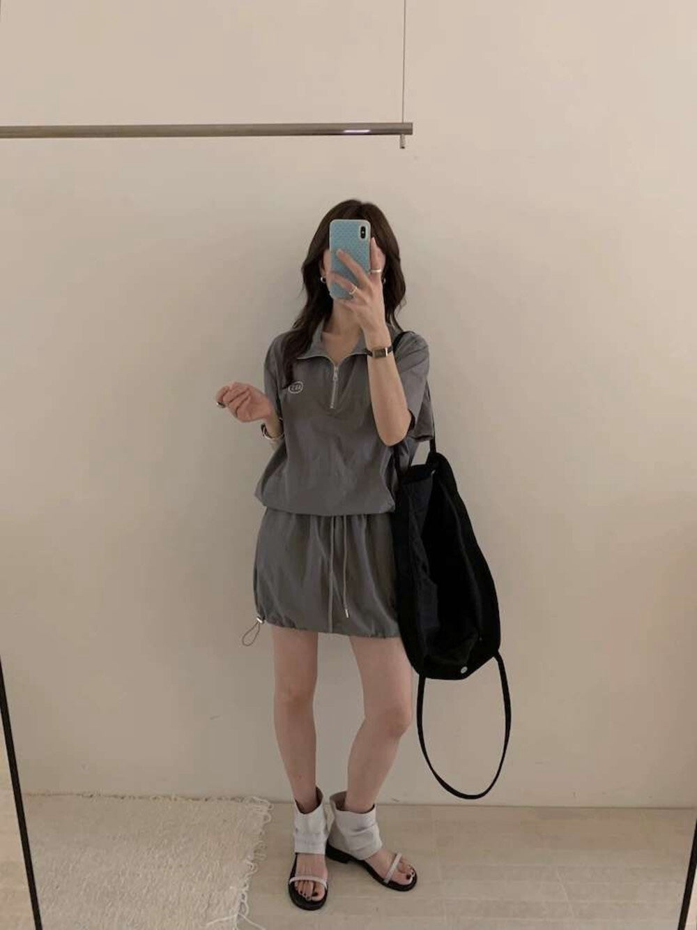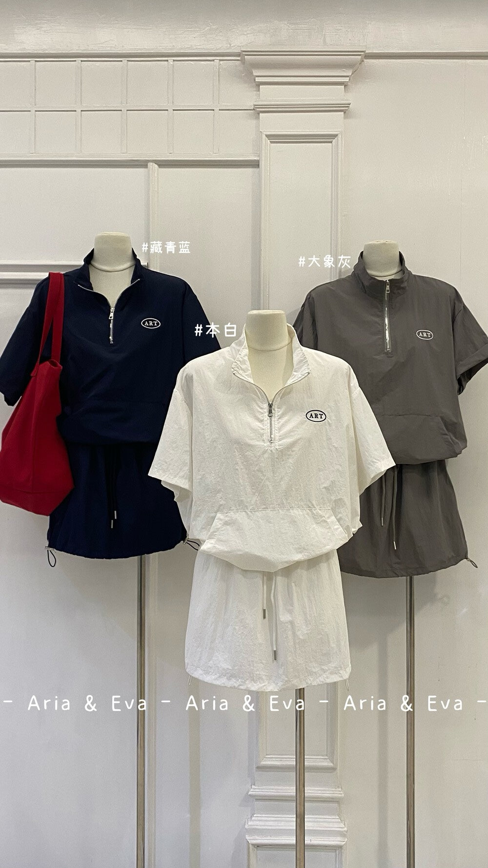 【新品】AE250758 韩系2件套 半拉链短袖上衣+抽绳半身裙